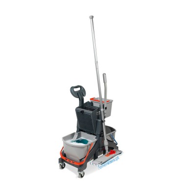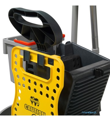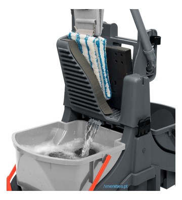 Balde com prensa vertical indicada para espremer esfregonas e mopas industriais. Ideal para limpeza de pavimentos em restauração ou hotelaria.