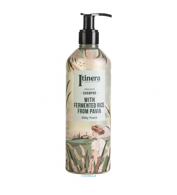 Shampoo Itinera com arroz fermentado de Pavia, rico em aminoácidos e vitaminas que limpam suavemente e proporcionam efeito seda ao cabelo. Ideal para hotéis e alojamentos premium que valorizam ingredientes naturais de excelência.