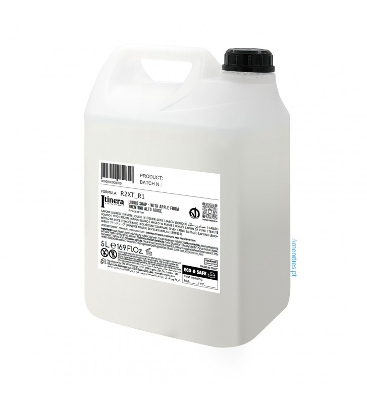 Sabonete líquido Itinera com maçã do Trentino, rica em vitamina A e minerais que hidratam e suavizam as mãos. Fórmula vegan com ingredientes naturais premium, perfeita para hotéis e alojamentos que procuram qualidade diferenciada.