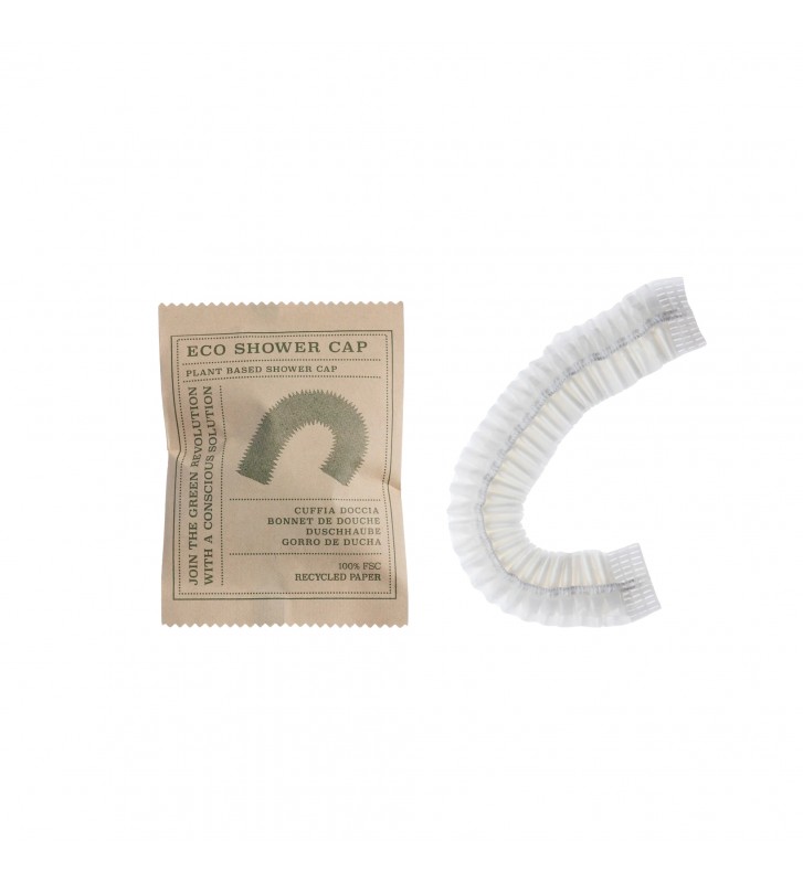 A touca de banho Eco Elements é fabricada em bioplástico (PLA) de origem vegetal, oferecendo uma alternativa 100% compostável e biodegradável às toucas tradicionais. Apresentada numa embalagem minimalista de papel Kraft com certificação FSC®, este acessório combina proteção premium para o hóspede com uma pegada ecológica nula.